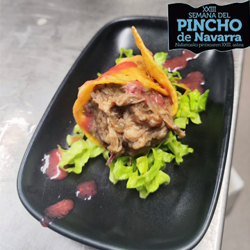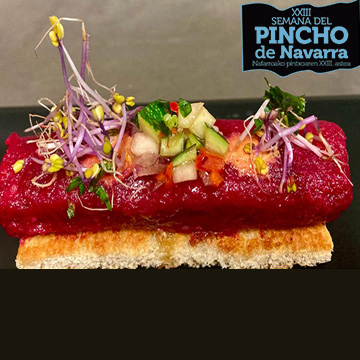 Un homenaje a San Fermín y el encierro. Con nuestro pincho queríamos representar a los corredores del encierro en San Fermín, Consta de dos pases siendo un guiso de rabo de toro tradicional el hilo conductor del pincho, el primer bocado es una chistorra madurada a las brasas en casa con una mahonesa de kimchi y menta, el segundo terminamos con un bocado dulce salada ácido de fresa y mora.
